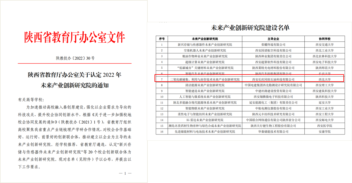 近日,陕西省教育厅发布了《陕西省教育厅办公室关于认定2022年未来产业研究院的通知》,我校与西安长庆同欣石油科技有限公司共同申报的“二氧化碳捕集、利用与封存技术未来产业创新研究院”获省教育厅认定建设,标志着我校双碳领域校企联合新型研发平台建设取得了新的进展。